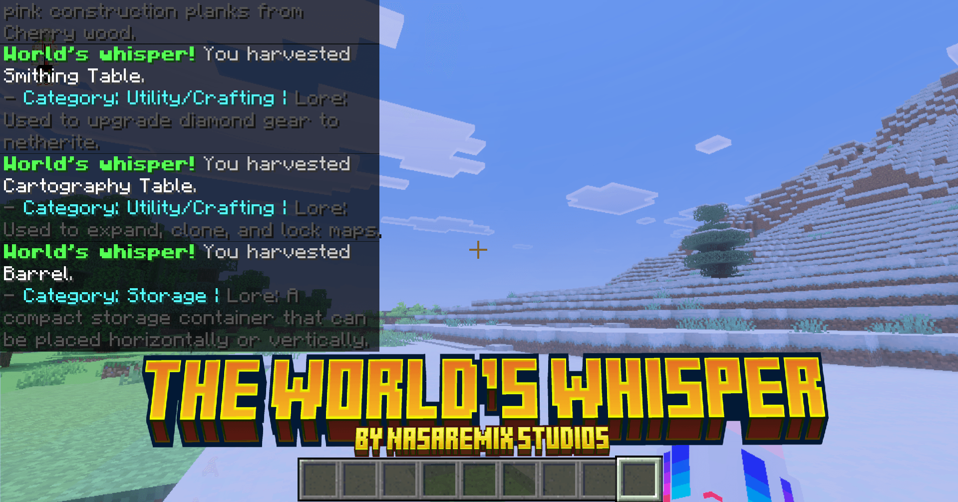 The World's Whisper silently records your discoveries. Get rich lore feedback on every new block you break or mob you kill, then stay silent for 30 min. Eliminates chat spam whi...